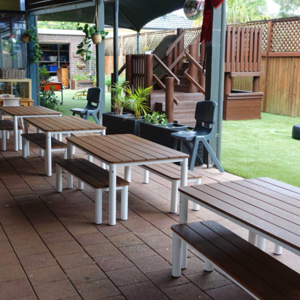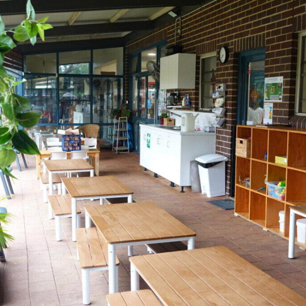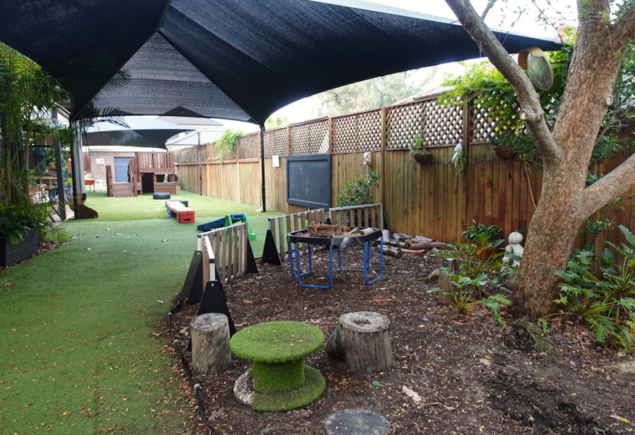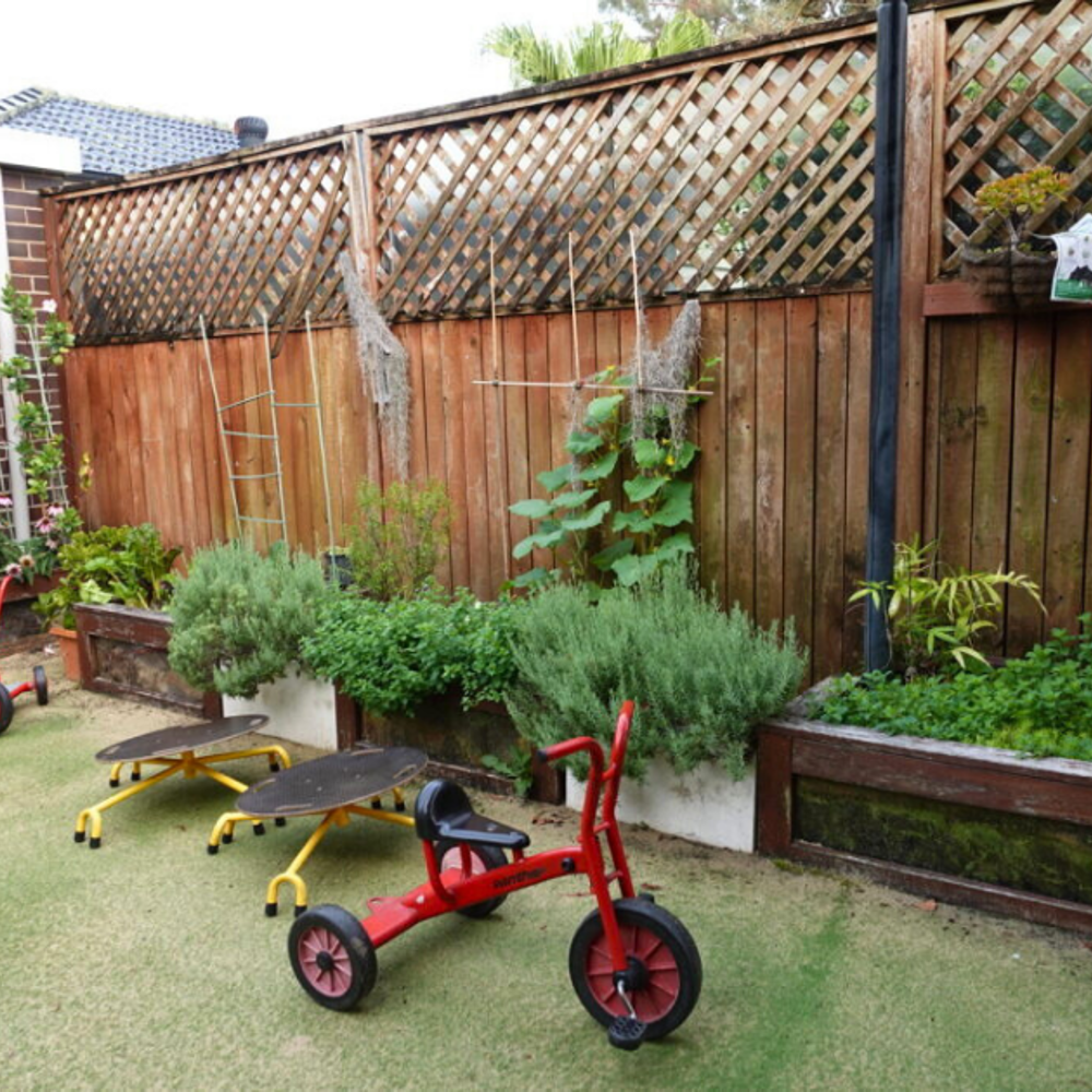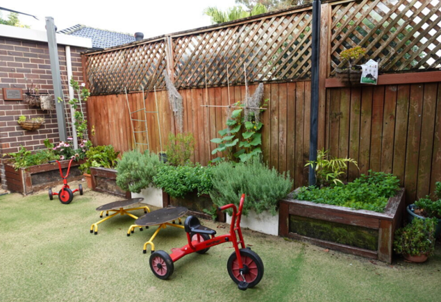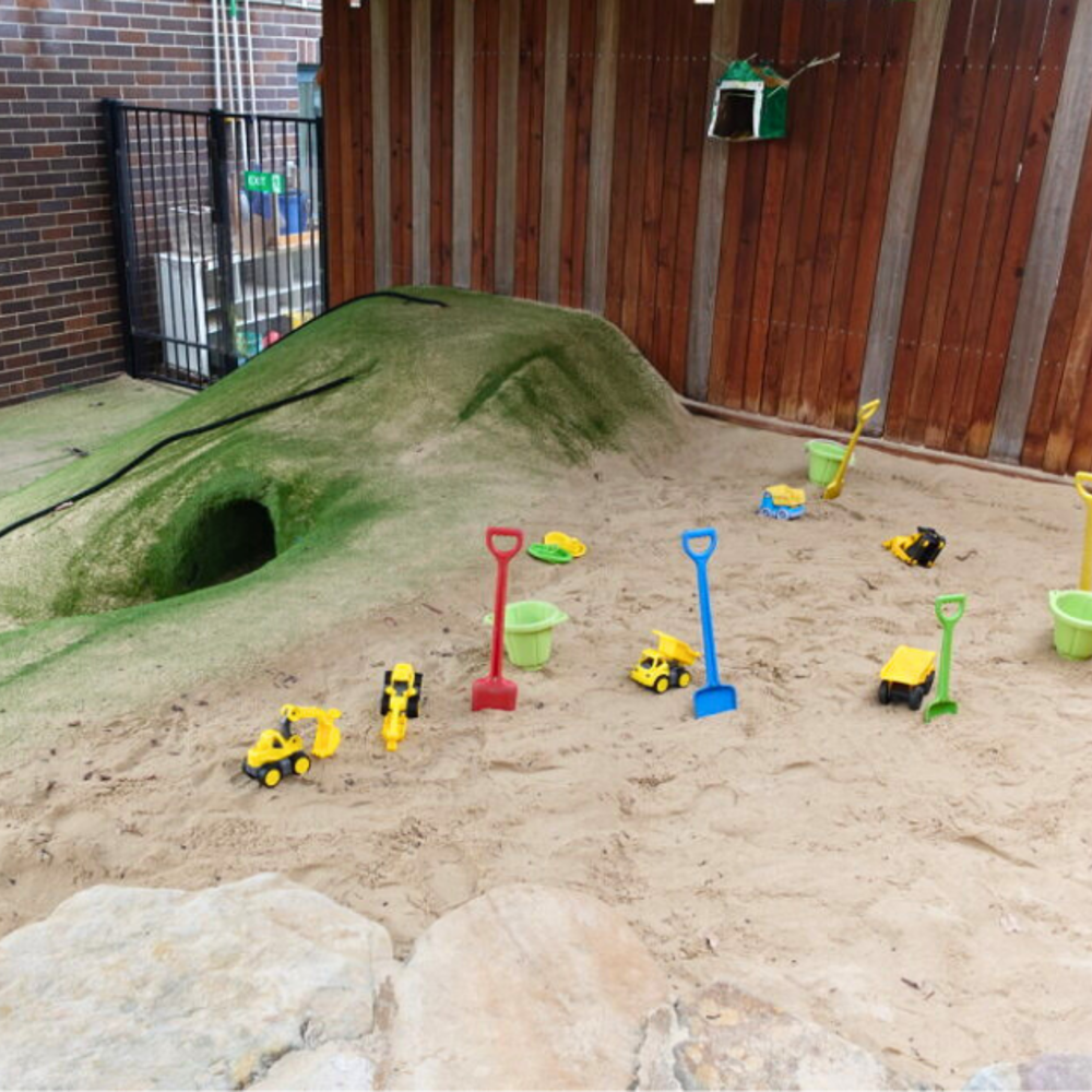 SDN Hurstville’s garden and play area has been redesigned and landscaped to provide a safe and exciting outdoor space to encourage children’s curiosity, physical skills and social play. It’s a light and airy space, shaded by large sails. It has a purpose-built mud kitchen, a miniature jungle gym, a sandpit on top of a low-incline climbing hill, and a wide double slide, which is good for socialising and sliding!