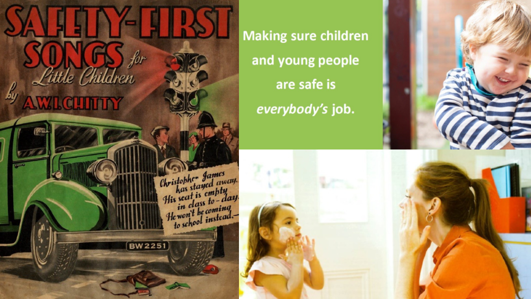 1 softcover music and nursery rhyme book.. Title on the front cover is 'Safety-first songs for little children', by A.W.I. Chitty. Title on the title page is 'Fourteen safety first and other good advice songs for little children', by A.W.I. Chitty. Published by W.H. Paling & Co.
