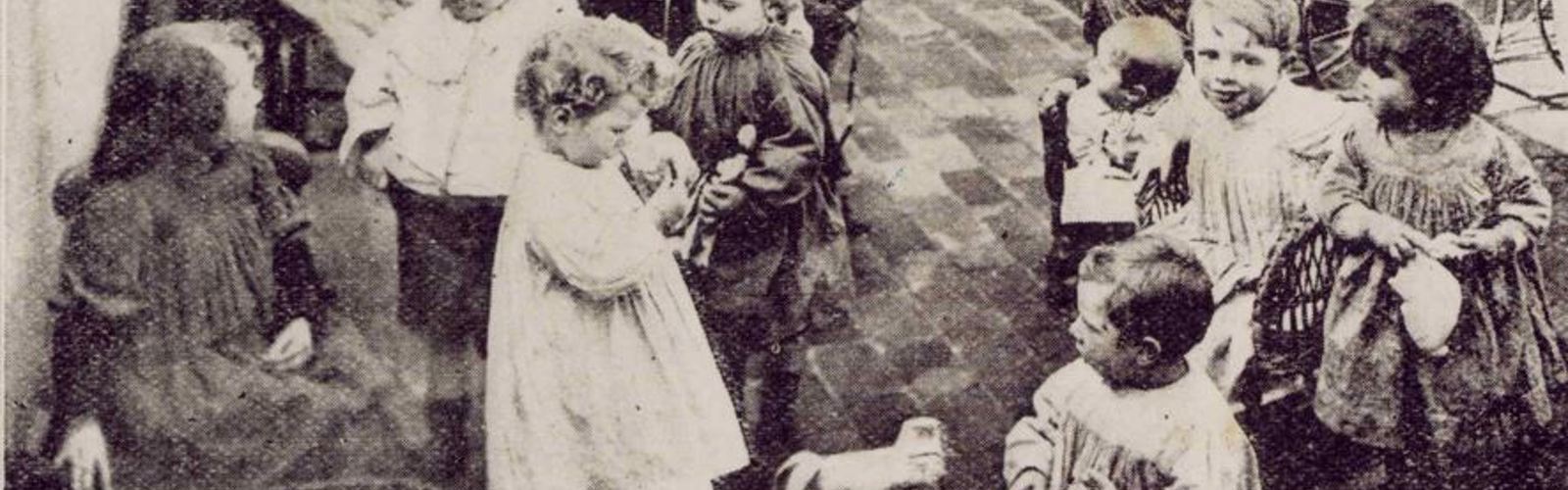 Children at play at Sydney Day Nursery, 126 Dowling Street in 1906 (SDN's first centre). Note the children are outdoors engaging with wooden horses, dolls and musical instruments.