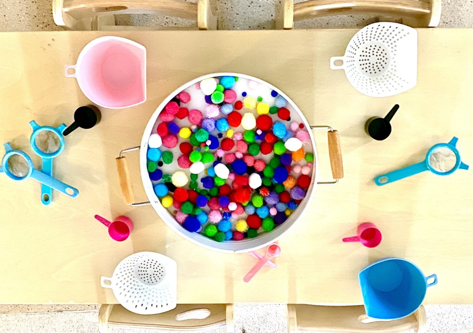 Support your child’s fine motor development, hand–eye coordination, and concentration as they scoop, sort, and pour pom-poms and small edible items like cereal using spoons, tongs, and cups