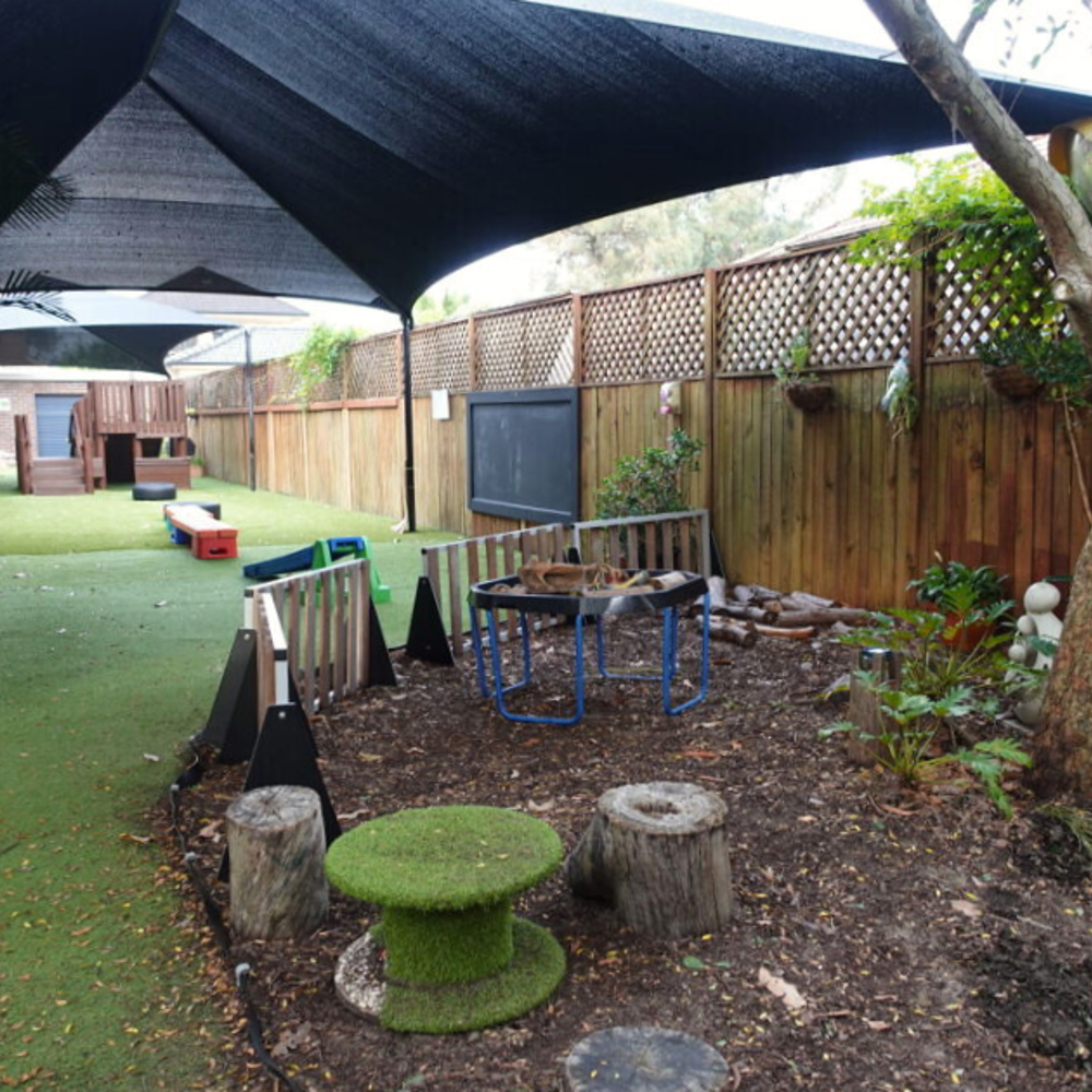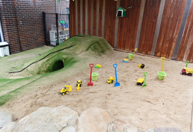SDN Hurstville’s garden and play area has been redesigned and landscaped to provide a safe and exciting outdoor space to encourage children’s curiosity, physical skills and social play. It’s a light and airy space, shaded by large sails. It has a purpose-built mud kitchen, a miniature jungle gym, a sandpit on top of a low-incline climbing hill, and a wide double slide, which is good for socialising and sliding!